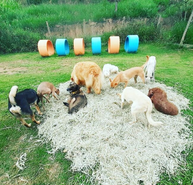 Recreação livre e orientada com atividades que trabalham e incentivam a integração na matilha, socialização, concentração, olfato, ordem e hierarquia.